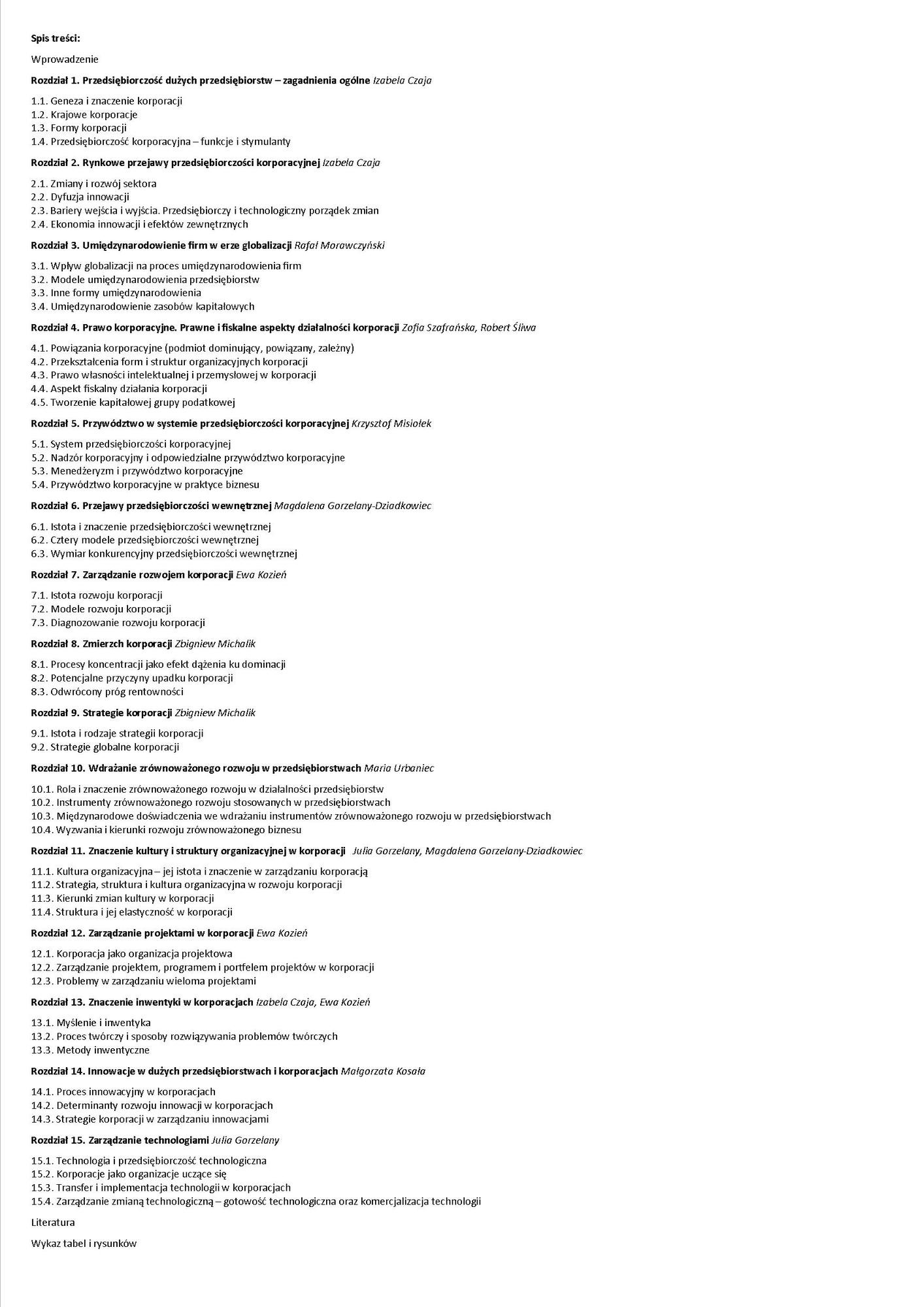 Książkę wyróżnia całościowe spojrzenie na zagadnienie kształtowania zachowań i postaw przedsiębiorczych w korporacjach, które określane jest jako intraprzedsiębiorczość. W procesie zarządzania korporacjami istotne jest wykorzystanie podejścia przedsiębiorczego, które w praktyce determinuje ich rozwój. W książce wyjaśniono wiele złożonych zagadnień, związanych z przedsiębiorczością korporacyjną w aspekcie ekonomicznym, prawnym, technologicznym, globalnym, przywództwa oraz kultury i innowacji. Celem publikacji jest holistyczne i interdyscyplinarne ukazanie złożonego systemu dużych i wielkich przedsiębiorstw, w których wnętrzu tworzone jest środowisko w rożnym stopniu rozwijające przedsiębiorczość korporacyjną. Adresatami są menedżerowie, pracownicy korporacji, studenci oraz czytelnicy zainteresowani poszerzeniem wiedzy z zakresu przedsiębiorczości korporacyjnej. Książka została napisana przez pracowników naukowych trzech katedr Uniwersytetu Ekonomicznego w Krakowie: Katedry Przedsiębiorczości i Innowacji, Katedry Strategii Zarządzania i Rozwoju Organizacji oraz Katedry Prawa Międzynarodowego, a także Katedry Gospodarki Przestrzennej i Architektury Krajobrazu Uniwersytetu Rolniczego w Krakowie. Stanowi ona kontynuację wcześniejszej publikacji pt. „Przedsiębiorczość i zarządzanie małym i średnim przedsiębiorstwem”.