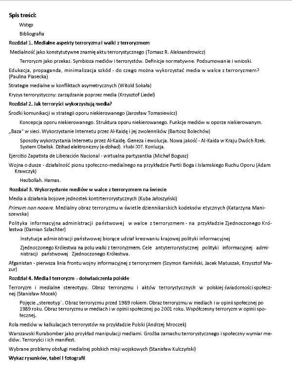 Książka: "Terroryzm w medialnym obrazie świata" przedstawia pełne spektrum tematów, które związane są z jednej strony z działaniami terrorystów w kontekście relacji medialnych, z drugiej - z dziennikarstwem w sytuacji kryzysowej, i wreszcie z trzeciej - z działaniami rządu w kontekście relacji medialnych w sytuacji kryzysowej. Fakt istnienia tych trzech podmiotów: terrorystów, dziennikarzy i przedstawicieli rządu - stanowi podstawę relacji i kształtowania strategii i polityki medialnej i informacyjnej, które ukierunkowane są na wpływanie na społeczeństwo. W książce grono Autorów - ekspertów - przedstawia sposoby, w jaki terroryści wykorzystują media, jak i proponuje metody, jakie zastosować może administracja publiczna, aby poprzez współpracę z mediami terroryzmowi przeciwdziałać. Autorzy książki - to zarówno badacze terroryzmu, badacze mediów, jak i praktycy, którzy ze zwalczaniem terroryzmu z wykorzystaniem środków walki informacyjnej zetknęli się w swojej karierze zawodowej. Dzięki temu jest to jedna z pierwszych na polskim rynku pozycji, które tak kompleksowo podchodzą do zagadnienia medialnego wymiaru terroryzmu w zestawieniu z medialnym wymiarem zwalczania tego zjawiska. [źródło opisu i okładki: http://www.isppan.waw.pl/ksiegarnia/terroryzm.htm ]