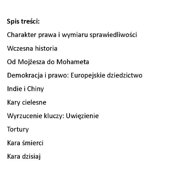 Na ścianach, pochodzących z czasów paleolitu, jaskiń w Addaurze na Sycylii wyryto obraz, na którym przedstawiono kilka ludzkich postaci zgrupowanych wokół skulonego mężczyzny, który wydaje się być związany w taki sposób, że każda próba uwolnienia się, skutkowałby uduszeniem. Uważane za najwcześniejsze świadectwo kary, malowidła te pokazują, że kara istnieje tak samo długo jak społeczność ludzka. Dla celów tej książki kara będzie rozumiana jako sankcja nakładana przez państwo na winowajcę, który popełnił przestępstwo. Przestępstwo to każde działanie, które państwo uznaje za czyn niezgodny z prawem. [źródło opisu i okładki: https://ksiegarnia.bellona.pl/?c=ksiazka&bid=5040 ]
