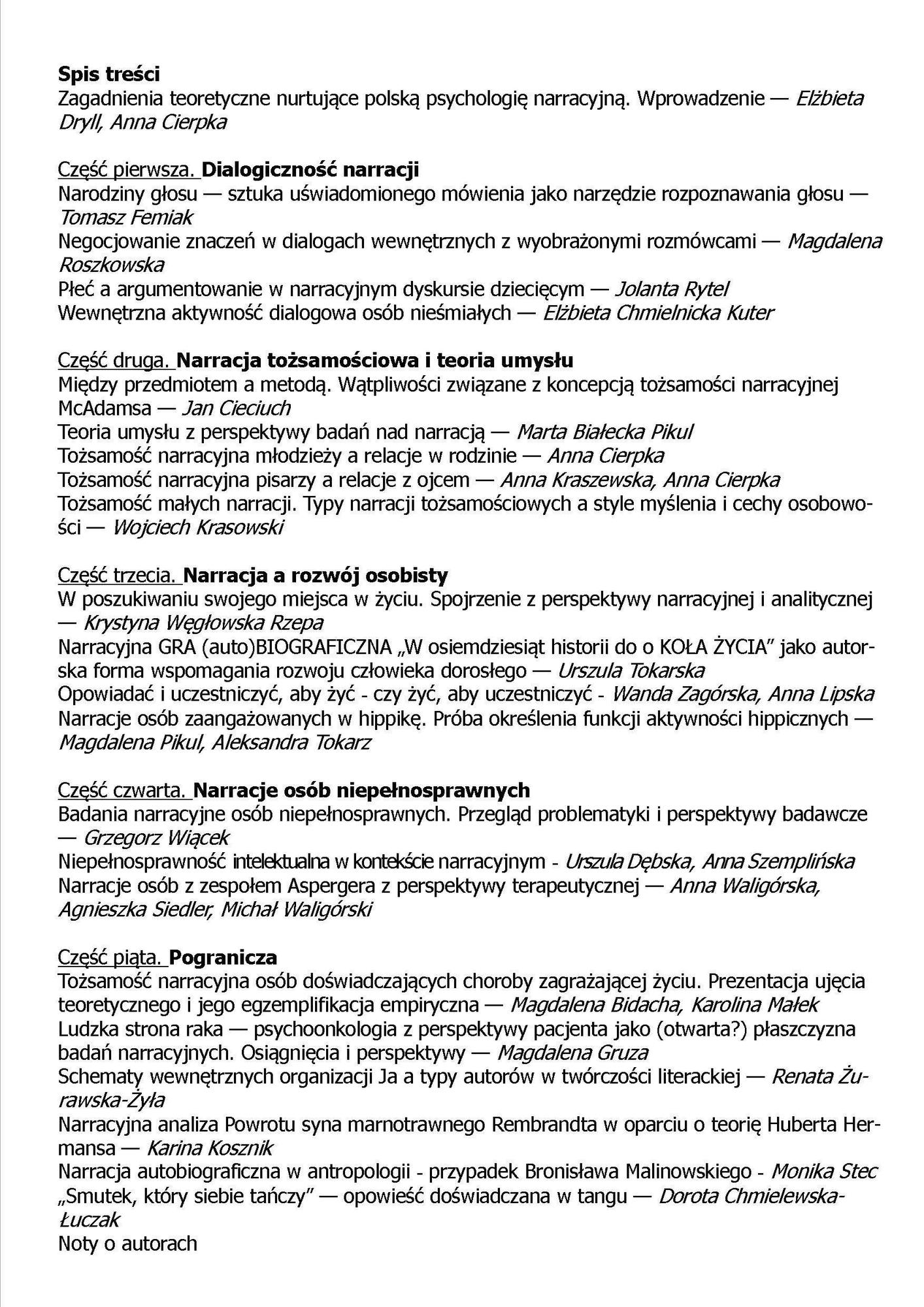 Psychologia narracyjna stała się obecnie jednym z ważniejszych nurtów teoretycznych nauki o człowieku. Jej metodologia pozwala docierać do tego, co zwykle wymyka się badaniom eksperymentalnym - warstwy subiektywnych, unikalnych znaczeń, z jakich człowiek konstruuje wewnętrzny świat. Umożliwia jednak nie tylko idiograficzny opis jednostki, ale i odkrywanie zasad, według których jej unikalność tworzy się i funkcjonuje. Książka zawiera opracowania teoretyczne i sprawozdania z aktualnie prowadzonych badań w nurcie narracyjnym. Jest adresowana do psychologów, ale również do przedstawicieli innych dyscyplin: kultu rożna wstwa, lingwistyki czy medycyny. Książka Psychologia narracyjna. Tożsamość, dialogowość, pogranicza jest obszernym zbiorem zróżnicowanych tematycznie tekstów, poświęconych problematyce należącej do jednego z najprężniej rozwijających się nurtów współczesnej humanistyki, który jest widoczny głównie w literaturoznawstwie, antropologii kultury, socjologii, a także coraz wyraźniej w psychologii. Ze względu na interdyscyplinarny i wielowątkowy charakter zgromadzonych tekstów całość opracowania podzielona została słusznie na pięć względnie niezależnych części, które łączy ogólna idea narracyjności.