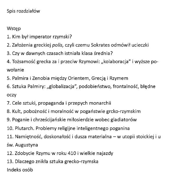 Imperium zwane rzymskim było w istocie grecko-rzymskie. Po pierwsze ze względu na język. W zachodniej części imperium mową potoczną była łacina lecz we wschodniej – greka. Po drugie, rzymska kultura materialna i obyczajowa wyrosła z asymilacji kultury helleńskiej. Po trzecie, samo imperium było syntezą rzymskiej władzy i cywilizacji greckiej. Rzymianie przejęli kulturę od Greków, nie tracąc własnej tożsamości narodowej, byli w tym trochę podobni do współczesnych Japończyków, którzy przyjęli wiele z kultury europejskiej, bynajmniej nie przestając być Japończykami. [źródło opisu i okładki: http://derewiecki.pl/sklep/serie-wydawnicze/biblioteka-historyczna/imperium-grecko-rzymskie/ ]