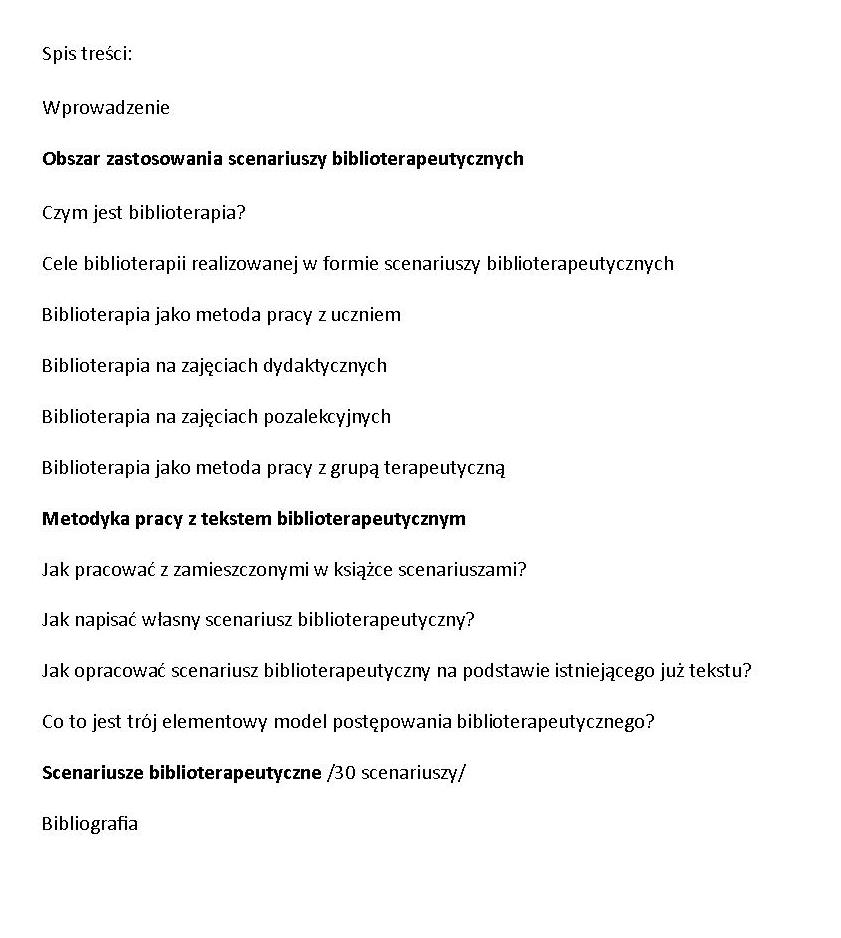 W książce przedstawiono wyjątkowe scenariusze, przeznaczone do pracy z grupą. Głównym celem zamieszczonych tekstów jest profilaktyka oraz praca z emocjami. Scenariusze mogą znaleźć zastosowanie zarówno na zajęciach dydaktycznych, jak i socjoterapeutycznych, czy spotkaniach z grupą wsparcia. Książka jest nie tylko źródłem pomysłów do pracy z grupą, ale również poradnikiem, w jaki sposób pisać własne, autorskie scenariusze bibliterapeutyczne. Realizatorami przedstawionych tekstów mogą być nauczyciele szkół szczebli podstawowych, gimnazjalnych, zawodowych oraz licealnych. Mogą być one proponowane uczniom w ramach zajęć dydaktycznych i pozalekcyjnych (np. w świetlicach terapeutycznych). [źródło opisu i okładki: http://medbook.com.pl/ksiazka/pokaz/id/4957/tytul/biblioterapia-w-praktyce-poradnik-dla-nauczycieli-wychowawcow-i-terapeutow-konieczna-impuls ]