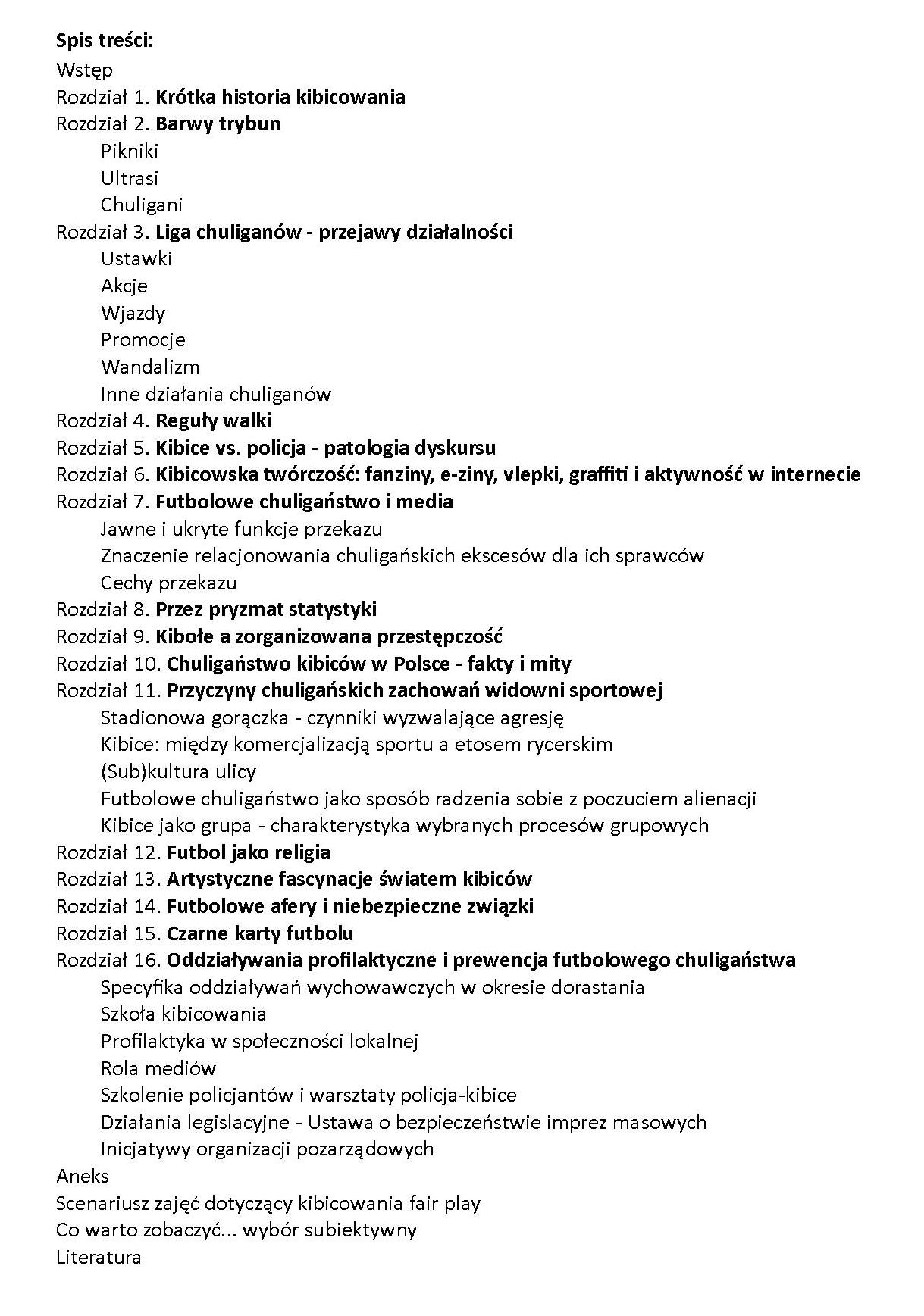 Książka przedstawia zjawisko agresywnego zachowania kibiców piłki nożnej, które w ostatnich latach stało się szczególnie ważnym problemem społecznym nie tylko w Polsce. [źródło opisu i okładki: http://lubimyczytac.pl/ksiazka/208754/chuligani-a-kultura-futbolu-w-polsce ]