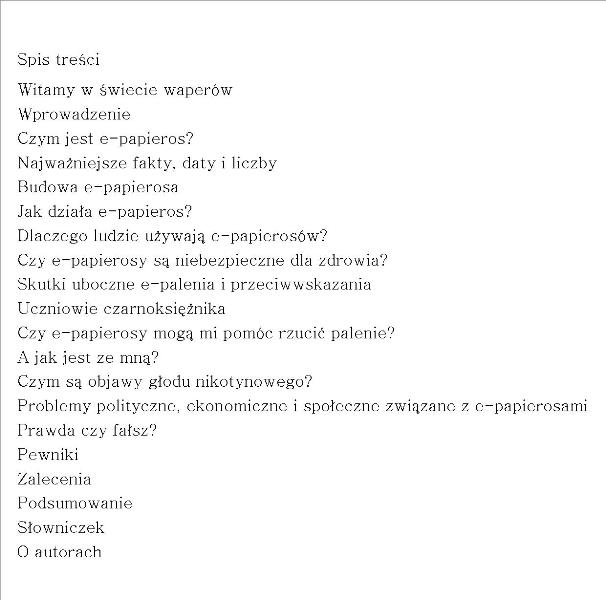 Popularność e-papierosów, które pojawiły się na światowym rynku niedawno, rośnie lawinowo. Uważa się, że w Europie i Stanach Zjednoczonych używa ich już 10 milionów osób. W samej Francji jest to półtora miliona osób, a w Polsce temat e-papierosów staje się coraz bardziej aktualny wraz ze wzrostem ich dostępności i aktywnym marketingiem. Często e-papierosy są reklamowane jako zdrowa alternatywa dla papierosów. Czy tak jest rzeczywiście? Czy e-papierosy są bezpieczne? Czy pozwalają rzucić palenie? Czy pozwalają zaoszczędzić pieniądze? Jakie normy regulują produkcję e-papierosów? Na te i na wiele innych pytań odpowiada w swojej książce prof. Jean-Franois Etter. Pisze w sposób zrozumiały, przejrzysty, a jednocześnie całkowicie zgodny z najbardziej aktualną wiedzą medyczną. Książka pozwala zrozumieć, czym są e-papierosy, czym różnią się od wyrobów tytoniowych, co mówi o nich medycyna, do czego mogą być przydatne, jak są zbudowane, jakie jest ich miejsce w przestrzeni publicznej, prawie i przemyśle. Dostarcza rozlicznych praktycznych wskazówek osobom, które zechcą porzucić palenie tytoniu na rzecz e-papierosów. [źródło opisu i okładki: http://www.wydawnictwofilia.pl/Ksiazka/29 ]