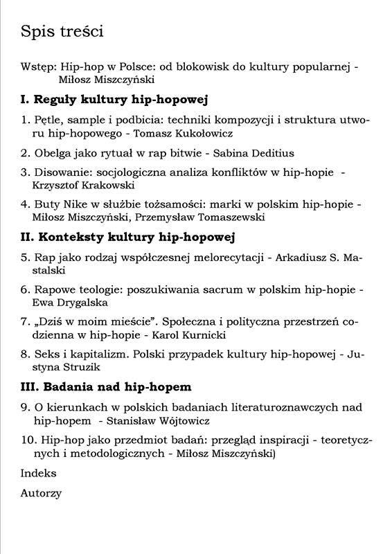 Autorzy, reprezentujący różne dyscypliny naukowe (socjologia, antropologia kulturowa, językoznawstwo, literaturoznawstwo), przedstawiają znaczenie kultury hip-hopowej dla kultury popularnej w Polsce oraz opisują reguły i konteksty hip-hopu i sposoby ich badania naukowego. Interpretują wybrane aspekty kultury hip-hopowej, używając specyficznych dla swoich dyscyplin aparatów teoretycznych i metodologicznych. Publikacja daje różnorodny obraz zjawiska, które od połowy lat 90. XX w. ugruntowuje swoją pozycję w polskiej kulturze. Autorzy stawiają też pytanie o zakres wpływu hip-hopu na język czy kulturę popularną oraz funkcje, jakie spełnia on w konstrukcji współczesnej tożsamości, zachęcając przedstawicieli różnych dyscyplin naukowych do dalszych badań i dyskusji. [źródło opisu i okładki: http://www.wuw.pl/product-pol-193-Hip-Hop-w-Polsce-od-blokowisk-do-kultury-popularnej.html ]