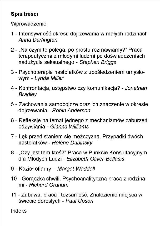 Od ponad pięćdziesięciu lat Oddział Terapii Nastolatków Kliniki Tavistock pomaga młodym ludziom i ich rodzinom. W tej książce pracownicy Oddziału przystępnie omawiają różne kliniczne aspekty zaburzeń okresu dojrzewania, a szczególnie ich wpływ na rodzinę. Autorzy poszczególnych rozdziałów opisują: zaburzenia o różnym nasileniu, od problemów z przystosowaniem w szkole po anoreksję i psychozę, rozwój nastolatków wychowywanych w małych rodzinach i proces kształtowania się ich poczucia tożsamości. Okres dojrzewania to jeden z najbardziej burzliwych okresów rozwojowych. W ciągu kilku lat między pokwitaniem a wkroczeniem w dorosłość jednostka musi zaadaptować się do fizycznych zmian związanych z rozmiarami, kształtem, siłą i budową ciała, a także z ogólnym wyglądem, brzmieniem głosu oraz dojrzałością seksualną. Prowadzi to do różnych psychicznych i społecznych konsekwencji: młoda osoba zyskuje zdolność do nawiązywania intymnych relacji z ludźmi, angażowania się w kontakty seksualne, zmniejszenia zależności od rodziców oraz dążenia do separacji od rodziny. Odbywając tę współczesną formę męskiej i kobiecej inicjacji, zdaje rozmaite egzaminy i przygotowuje się do zdobycia pracy. Podsumowując, staje się niezależną jednostką pod względem wewnętrznym oraz zewnętrznym. To ogromne wyzwania. Niektórzy młodzi ludzie potrzebują wówczas profesjonalnej pomocy, zaś wszyscy – obecności dorosłych rozumiejących to, co się dzieje z nastolatkami. [źródło opisu i okładki: http://lubimyczytac.pl/ksiazka/177294/przetrwac-dojrzewanie-zaburzenia-okresu-dojrzewania-z-perspektywy-klinicznej ]
