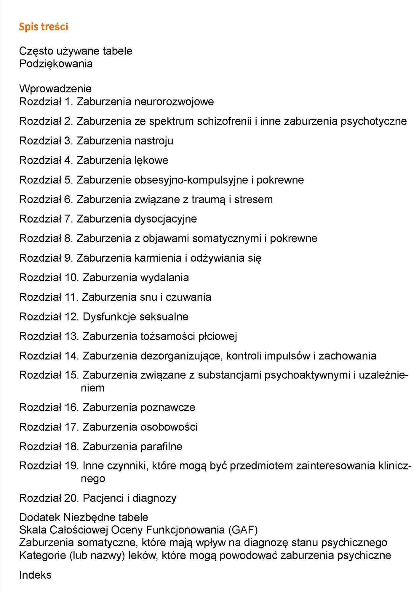 Każdy, kto zajmuje się badaniem i leczeniem pacjentów z zaburzeniami psychicznymi, powinien się zapoznać z najnowszym wydaniem podręcznika DSM-5® bez tajemnic, który stal się podstawową pozycją na świecie w zakresie stawiania diagnozy. James Morrison rzetelnie i przystępnie prezentuje cale spektrum kategorii diagnostycznych DSM-5. Jego książka charakteryzuje się głęboką mądrością i humorem, które sprawiają, że może być ona cennym źródłem dla tysięcy klinicystów. W tym wyjątkowym opracowaniu autor prezentuje ponad 130 przykładów ilustrujących typowe obrazy kliniczne oraz proces badania diagnostycznego. Morrison rzeczowo omawia każdy przypadek, wyjaśniając, dlaczego dany pacjent pasuje do określonych kryteriów diagnostycznych i czemu inne rozpoznania są mało prawdopodobne. Na szczególną uwagę zasługują: Ľ Krótkie przewodniki po kategoriach diagnostycznych omawianych w danym rozdziale. Ľ Opisy zasadniczych cech, czyli prototypów, przedstawiające objawy i inne elementy diagnostyczne każdego zaburzenia. Ľ Uwagi dotyczące kodowania, zawierające wskazówki na temat uszczegółowień, postaci i nasilenia zaburzeń. Ľ Ramki uwypuklające główne pojęcia warte zapamiętania. Ľ Tabele umożliwiające łatwy dostęp do ważnych informacji. Objaśniając zawiłości kryteriów DSM-5, autor przedstawia zarówno kody ICD-10-CM, jak i ICD-9-CM w odniesieniu do każdego zaburzenia. Zamieszcza także Skalę Całościowej Oceny Funkcjonowania (GAF) wraz z jasnym uzasadnieniem jej stosowania. Książka stanowi obowiązkową lekturę dla każdego klinicysty specjalizującego się w psychiatrii, psychologii klinicznej, klinicznej pracy socjalnej, pielęgniarstwie psychiatrycznym i poradnictwie psychologicznym. [źródło opisu i okładki: http://www.wuj.pl/page,produkt,prodid,2703,strona,DSM_5_bez_tajemnic,katid,84.html ]